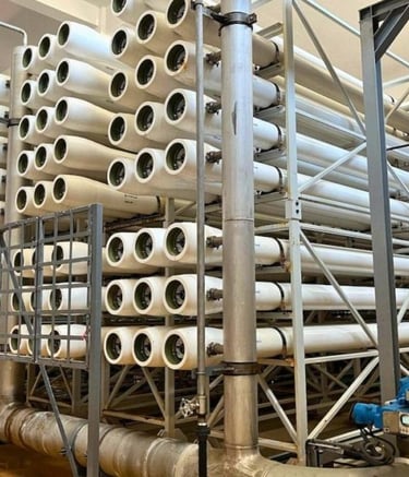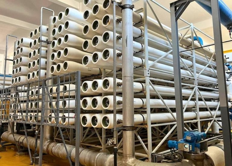 Le dessalement par membranes (osmose inverse) : l’eau est poussée sous haute pression à travers des membranes qui retiennent jusqu’à 95 % des sels et 99 % des impuretés.